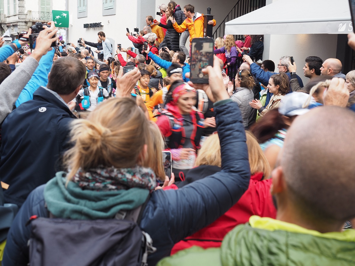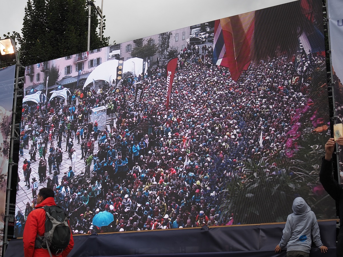 ドロップバッグもシャモニーに輸送されてきていて荷物は全て回収できた。メインイベントで参加者も多いためスタートゲートに近いところまで行けるか心配だったが近くまでは行けた。ただスタートライン近くには人が集まっていて、外側からカメラを頭上にかかげてやっと選手の姿を映せるくらい。直接自分の目ではぜんぜん見えない。