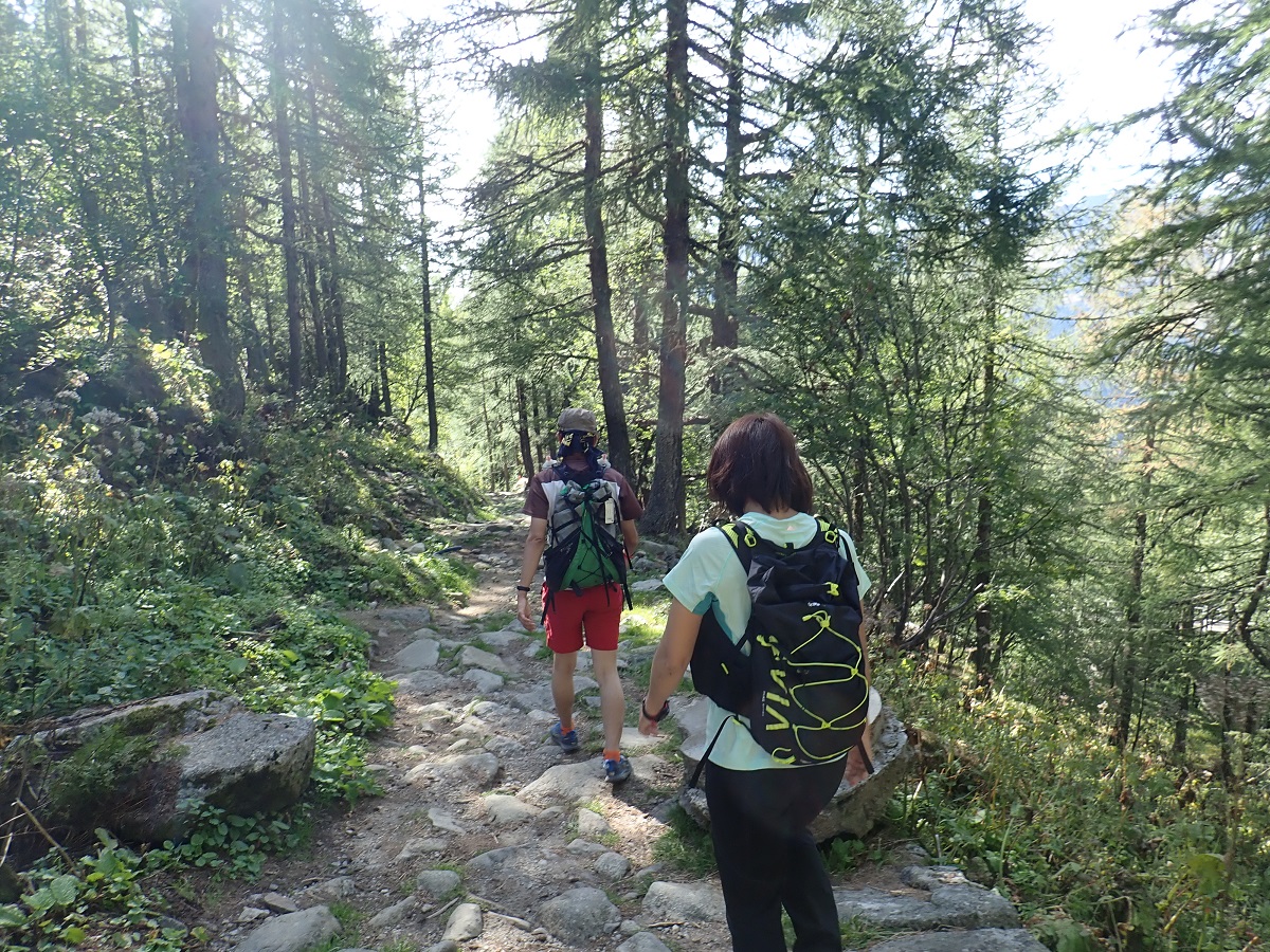 コースタイムをどのくらい短縮できるか意識して走らないまでも速歩きでスタート。途中からきつくなったが標高1300mくらいはなんとか押し切ろうと思い話をする余裕もなく黙々と登る。山自体は絶壁なので時々シャモニーの街を振り返ると水平距離はすぐそこのまま垂直方向にだけ街から離れていく感覚。