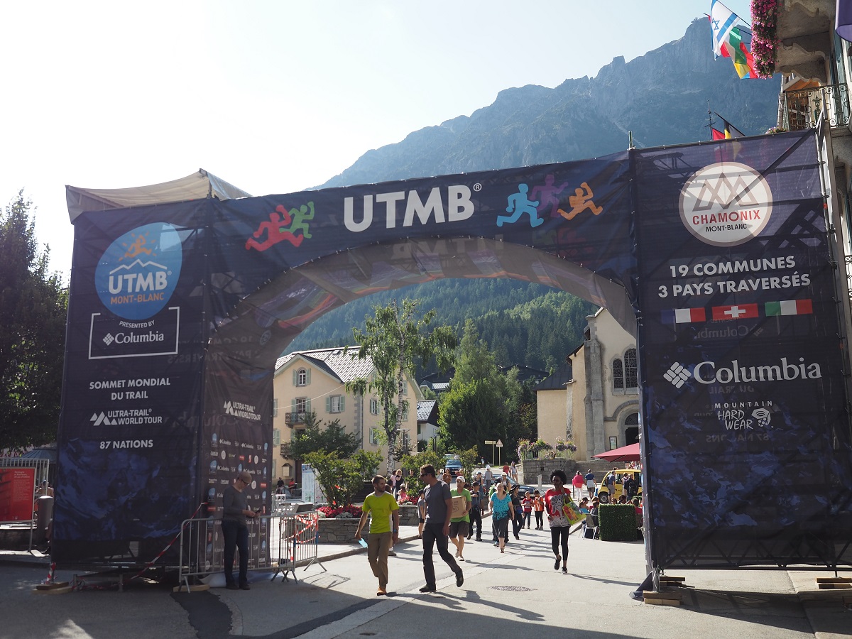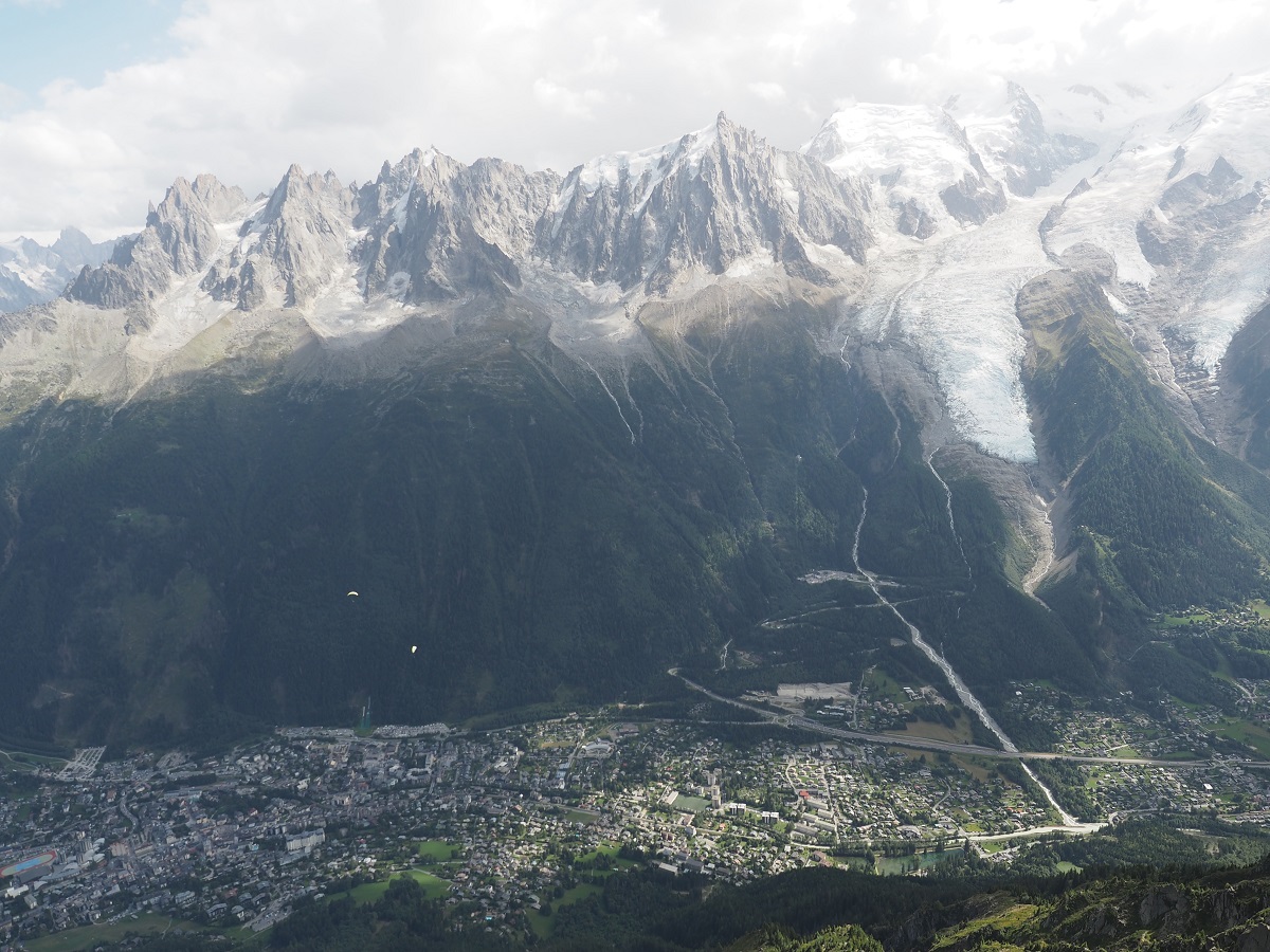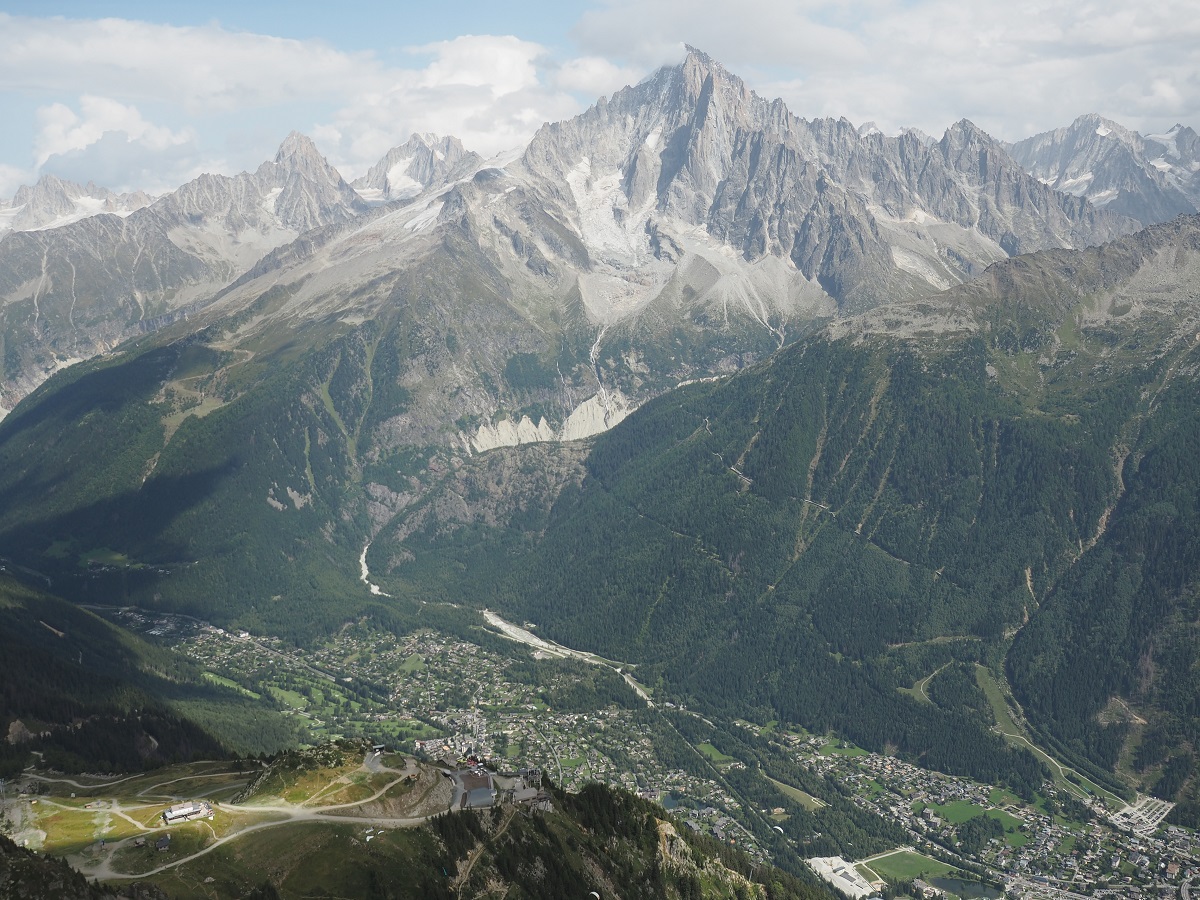 午後は昨日行ったシャモニーをはさんでエギューイ・デュ・ミディの反対側の山ブレヴァンにゴンドラとロープウェイで登る。こちらの山はスタート直後に登るのでゴンドラ下のじぐざぐトレイルをゴンドラから確認しながら。標高2500mのブレヴァンを通るトレイルでGPSナビの確認。それにしても景色は見事というしかない。UTMBが大人気なのもわかる。下りはゴンドラ乗り継ぎ駅まで歩いて下ることにしてコースデータのウェイポイント1から大会コースを外れて山を下る。パラグライダーの離陸地点でしばらく草の上でごろ寝してからゴンドラで下山。