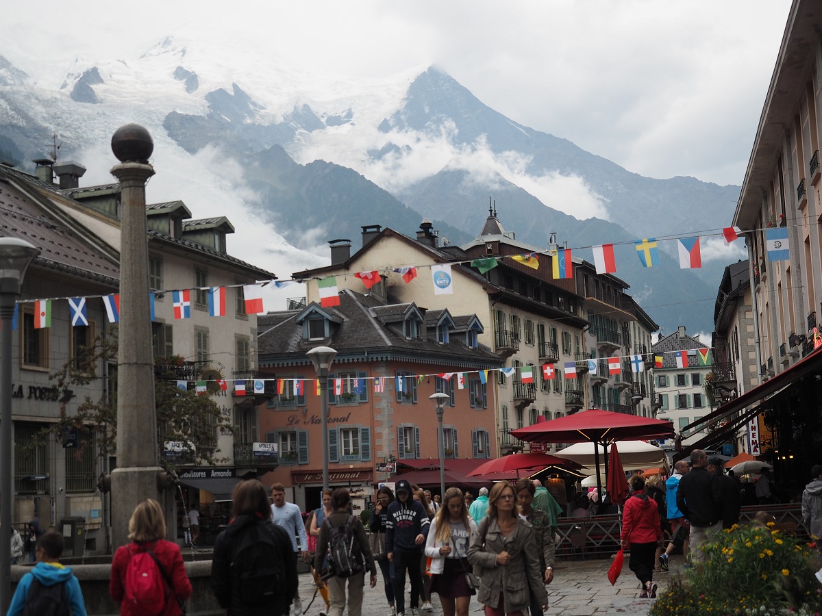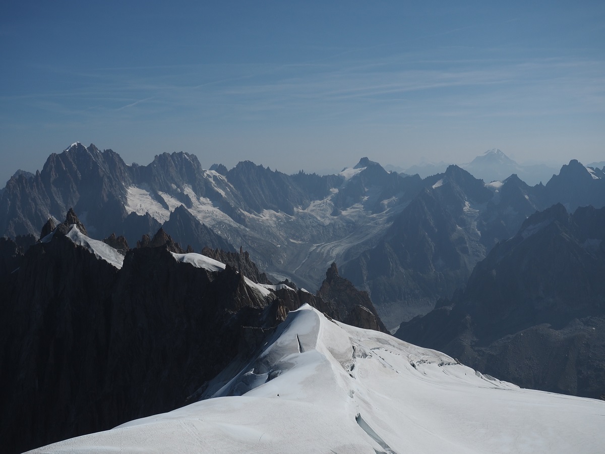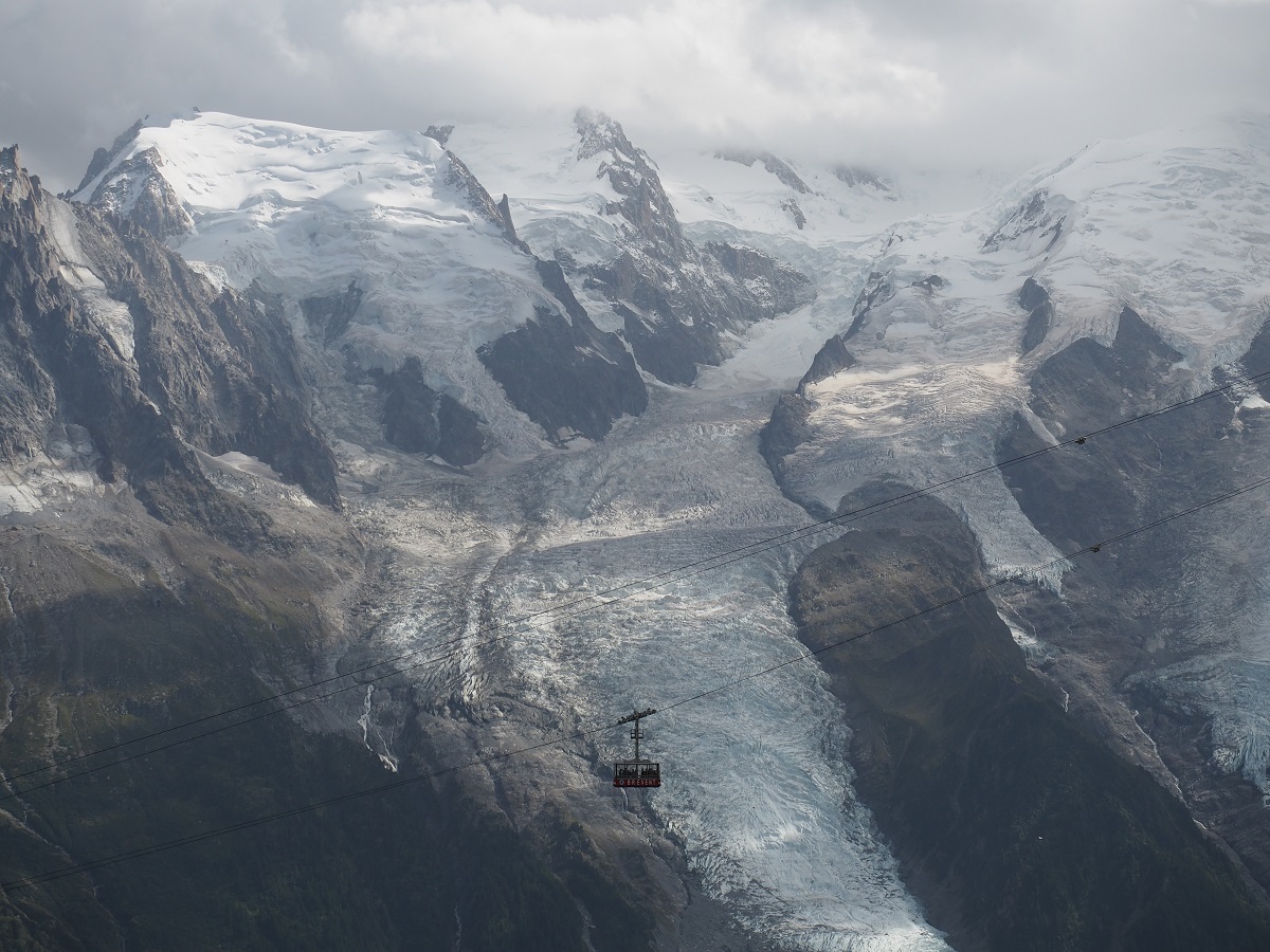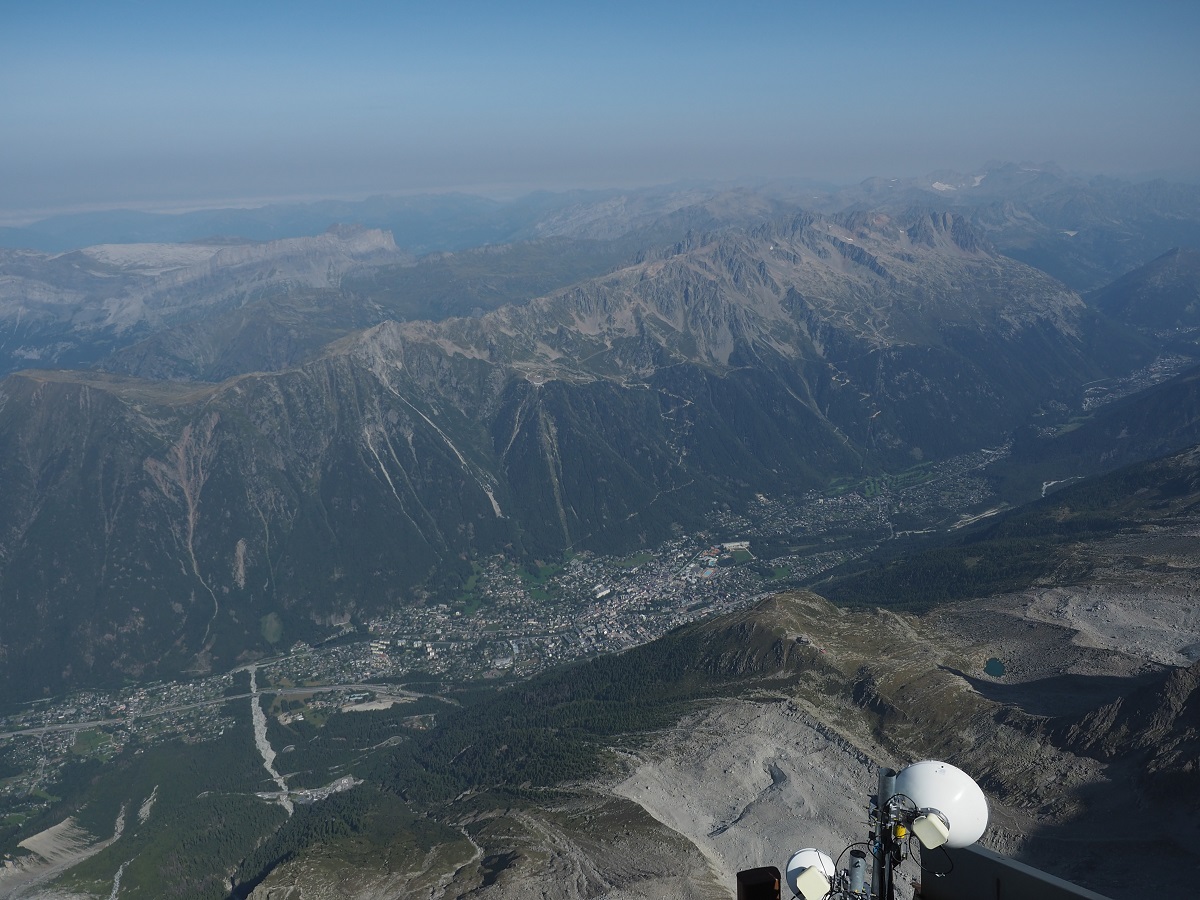 気温に関しては、朝のシャモニーは肌寒いくらい。半袖短パンで出かけたらロープウェイ乗ってすぐに寒くなりジャケットを着る。標高3800mでは気温は0度くらいだと思うが直射日光があると暖かい。それでも周りは氷だらけなのでみんな長袖長ズボンで薄手のダウンを着ているくらい。レインウェアまでは着こまずに観光できた。でも少しでも日が陰ったら寒かったと思う。