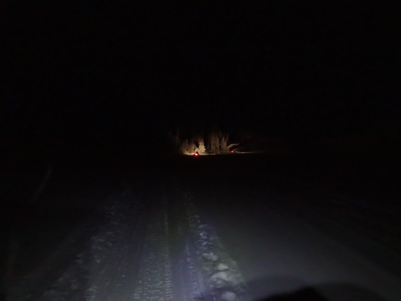 ■しばらく進むとスノーモービルが3台いた。「調子はどうだ?」と聞いてきたので大会関係者だろう。これでリタイアできると思い「シューズとソックスが凍った。もうだめだ」と一生懸命だめアピールをする。しかしスノーモービル隊はこの先に用事があるらしく「自分で次のCPを目指せないか?あと15kmだ」という。今、救助できないなら仕方がないので「やってみる」と答える。スノーモービル隊は行ってしまった。