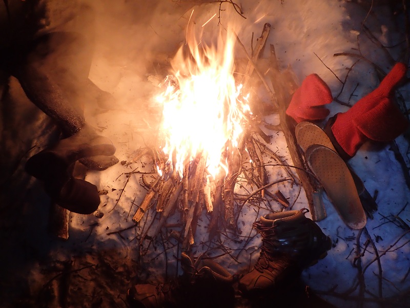 基本的には焚き火で服を乾かすという作戦は安易に取るべきではない。濡れた(湿った)ものはそんなに簡単には乾かない。シュラフで休むときにシュラフの中にソックスやシューズ、グローブを入れるが、乾かすというよりは凍らせないため、温かくしておいて行動開始時に履いた時の不快感、冷えで体温を持っていかれるのを防ぐため程度。もし時間を十分に取っても乾かしたい場合は、長い木の枝を3本組み合わせて三角錐を作り(先端をロープで縛る)火の真上に乾かしたいものを置いて乾かす。今回レース中に乾かそうとしたときは火の周りに並べてしまったため温まった程度で乾かすまで至らなかった。しかも早く乾くように火に近ずけすぎて焦げたり、溶けたりした。
