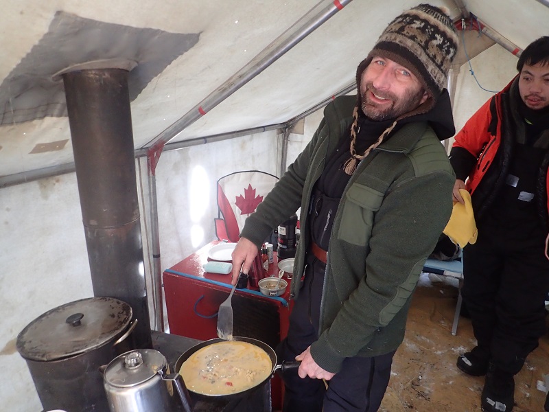 ■自分の立場が微妙で他の参加者たちと一緒に大会側のスノーモービルで輸送されるのか、平賀さんたちと一緒にいていいのかわからない。テントに戻るとジャズさんが朝食を作ってくれていた。